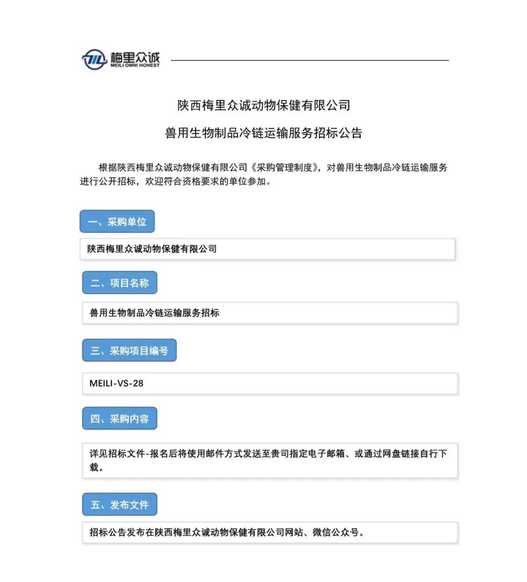 陜西梅里眾誠動物保健有限公司-獸用生物制品冷鏈運輸服務招標公告